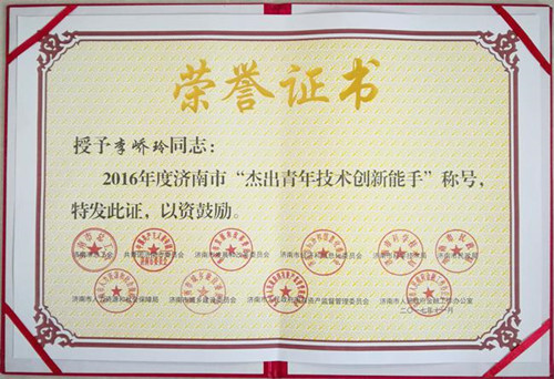 近日,濟(jì)南市總工會(huì)、團(tuán)市委、市發(fā)改委、市經(jīng)信委、市科技局、市民政局、市人社局、市城鄉(xiāng)建設(shè)委、市國資委、市金融辦聯(lián)合發(fā)文表彰2016年度濟(jì)南市青年崗位操作能手和青年技術(shù)創(chuàng)新能手。濟(jì)南城建集團(tuán)六分公司青年職工李嶠玲榜上有名,被授予2016年度濟(jì)南市杰出青年技術(shù)創(chuàng)新能手稱號(hào)。