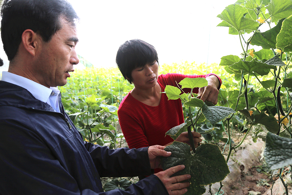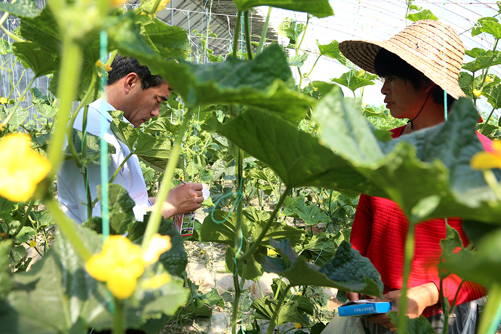 “打藥一定要按時打按量打,提前打了沒效果,拖后了就容易產(chǎn)生殘留,”陳德國仔細指導(dǎo)著黃瓜種植戶。