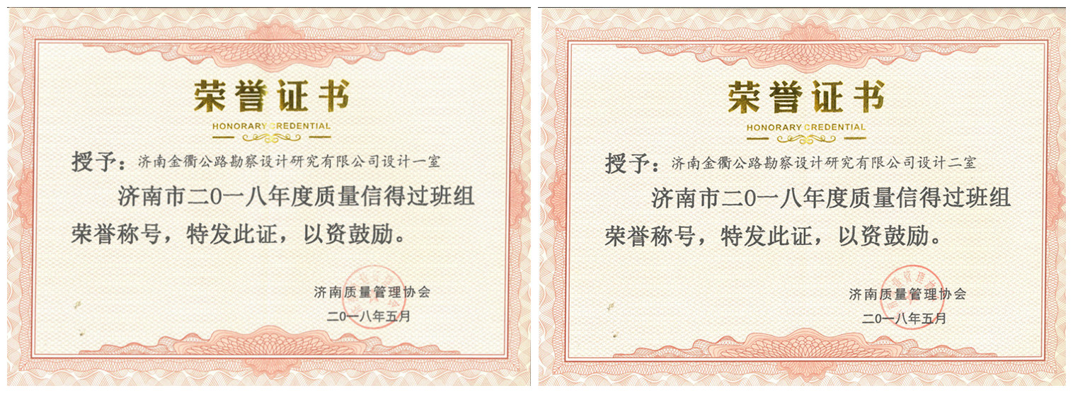 濟南金諾公路工程監理有限公司《提高基層水泥穩定碎石混合料強度》、《提升橋梁結構物混凝土外觀質量合格率》兩項課題榮獲“濟南市2018年度質量管理成果一等獎”;《提高新舊路基結合部路床壓實度》課題榮獲“濟南市2018年度質量管理成果三等獎”。