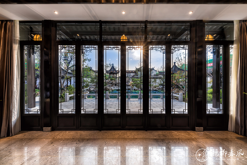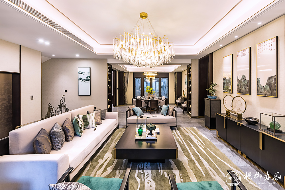 另一套大戶型樣板房采用新中式風(fēng)格,以儒家思想為依托,通過(guò)大理石、金屬銅、木材的有機(jī)結(jié)合,體現(xiàn)主人的穩(wěn)重、尊貴和優(yōu)雅。約110㎡的大面積庭院,演繹著四季不落幕的錦繡風(fēng)光;挑高約5.7米的地下空間,讓格調(diào)生活隨心定制。整套樣板房抒寫(xiě)著文雅靈動(dòng)的東方氣韻,展現(xiàn)了“中正和雅”的國(guó)風(fēng)意境。