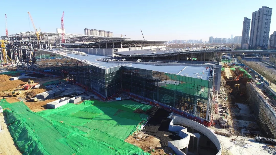 目前,展館區域已完成5個展館及4、5號館共享大廳、西輔房區域主體鋼結構與二次結構施工,正在進行裝飾安裝工程。地下車庫已完成除軌道M1線預埋段區域主體結構施工,正在進行二次結構、裝飾安裝、室外回填及剩余地下車庫主體結構工程施工。