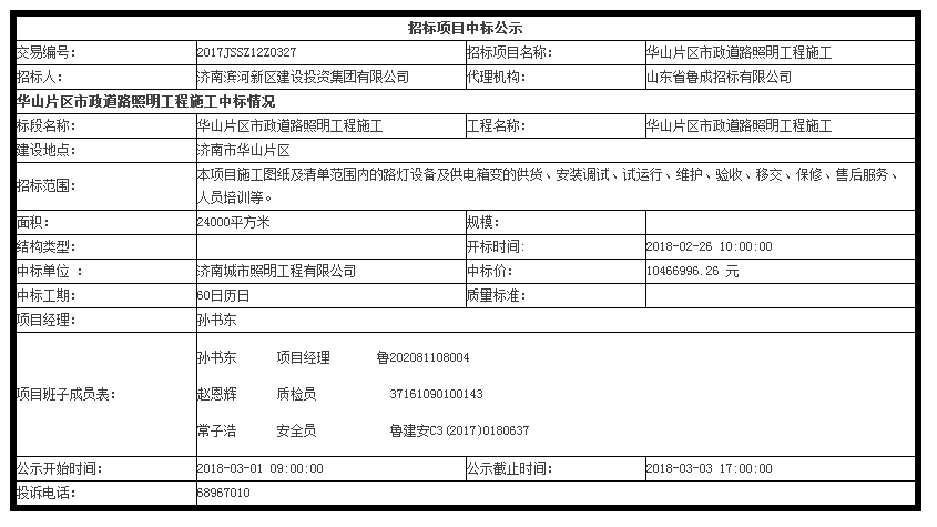 華山片區市政道路照明工程施工中標公示
