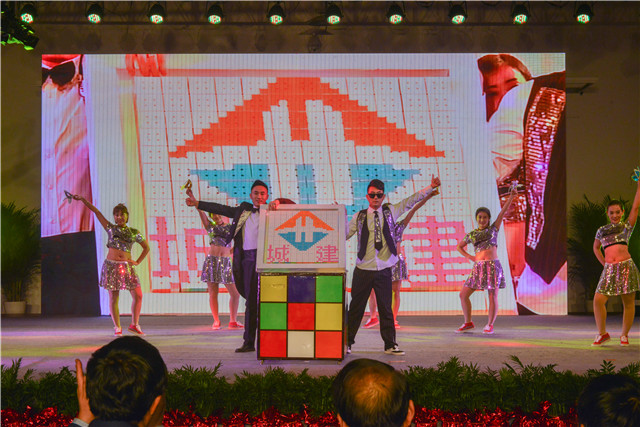 在歡快喜悅的歌舞《拜新年》中,匯演拉開序幕,紅紅火火的舞臺,映射著蒸蒸日上的發(fā)展勢頭。舞蹈《成長》《奮進》以激昂的音樂,吹響了催人奮進的號角,用動感的舞步,舞出了城建鐵軍的蓬勃朝氣?!恶R路情緣》《鐵軍男相親記》《生日》《真相》《男爭女辯》《筑夢同行》等語言類節(jié)目圍繞生產(chǎn)經(jīng)營精心編排,真實感人,催人奮進。勵志感人的歌曲,絢麗多彩的歌伴舞,酷炫的舞蹈,神秘的魔術(shù),魔幻的黑光劇,生龍活虎的京劇,讓觀眾著實過了一把眼癮,臺下掌聲不斷,歡欣喜悅的氣氛一浪高過一浪。小品里父母、妻子、孩子那一段段心里話,令人感同身受,潸然淚下,家屬們用實際行動表達了對企業(yè)最大的理解和支持,大家在這個溫暖的大家庭中,以誠相待,溫馨彼此。在激動人心的歌舞串燒《開創(chuàng)未來》中,匯演圓滿落下帷幕,集團領(lǐng)導(dǎo)與演職人員合影留念。