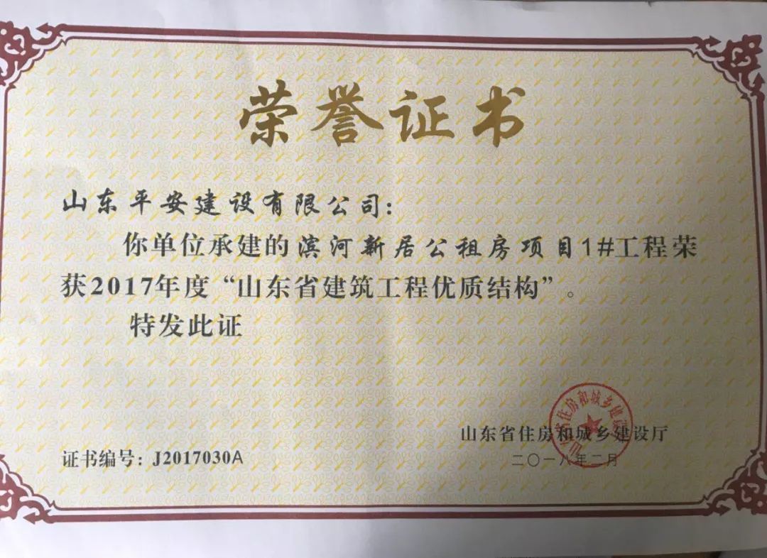 近日,由濟南城市建設集團負責建設的濱河新居公共租賃住房工程1#樓,在山東省住房和城鄉(xiāng)建設廳組織的2017年度“山東省建筑工程優(yōu)質(zhì)結構”評審中,憑借過硬的質(zhì)量、完善的管理順利通過專家考評,喜獲“山東省建筑工程優(yōu)質(zhì)結構”獎。
