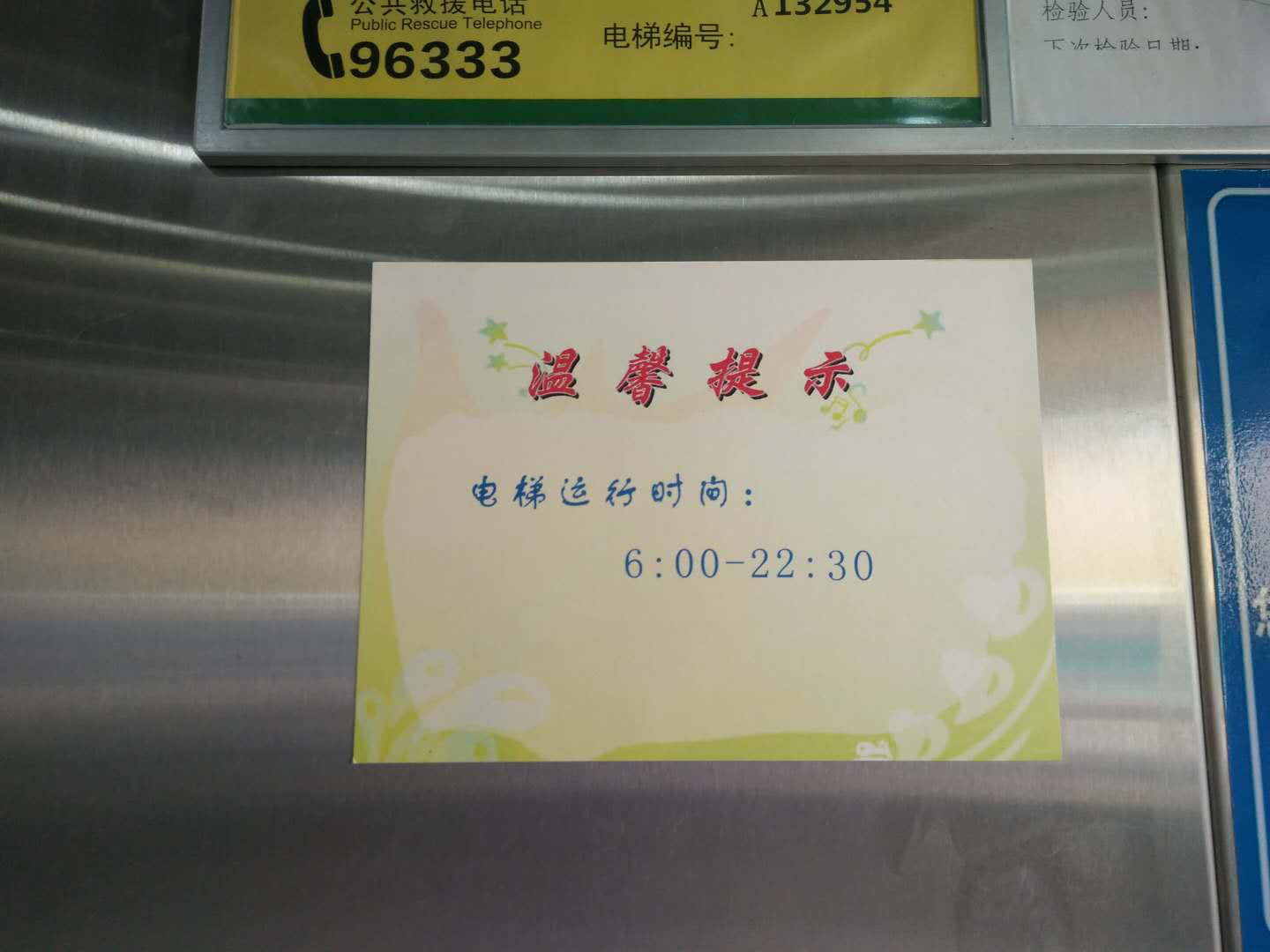 人行天橋6座電梯原運行時間為早晨6:00至夜間21:00。自2018年6月1日起,公司運維管理人員增加工作時間,將電梯夜間運行時間延長至22:30。
