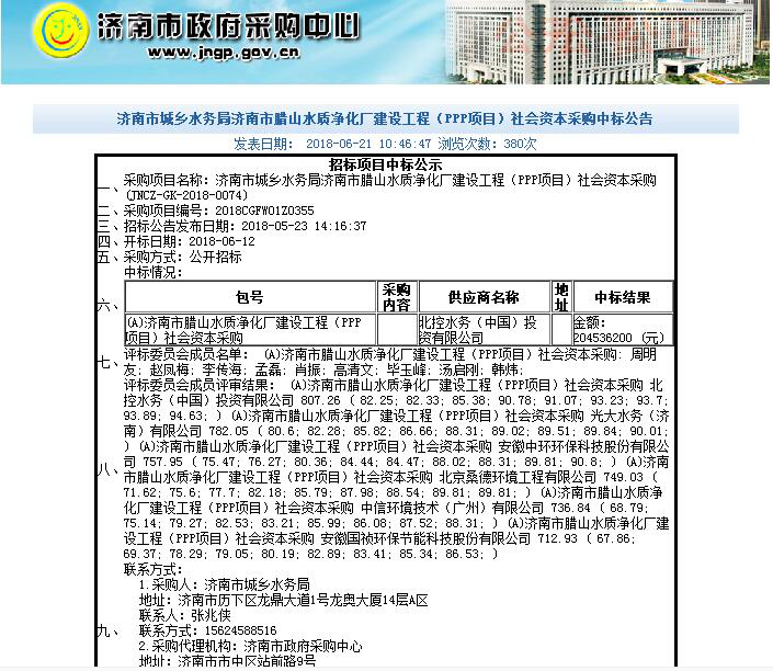 2018年6月14日-22日,按照市城鄉(xiāng)水務(wù)局要求,資產(chǎn)運(yùn)營(yíng)公司參加臘山水質(zhì)凈化廠ppp項(xiàng)目預(yù)中標(biāo)社會(huì)資本談判會(huì),按照政府采購(gòu)中心要求與前三名中標(biāo)人進(jìn)行會(huì)談,按程序最終確定成績(jī)第一名的北控水務(wù)(中國(guó))投資有限公司中標(biāo)。21日濟(jì)南市政府采購(gòu)中心開始進(jìn)行中標(biāo)公示,22日資產(chǎn)運(yùn)營(yíng)召專題研究會(huì),與北控水務(wù)就合作協(xié)議、公司章程相關(guān)內(nèi)容與條款進(jìn)行討論,研究部署組建ppp公司相關(guān)工作,倒排工期,壓茬推進(jìn)各項(xiàng)前期工作。