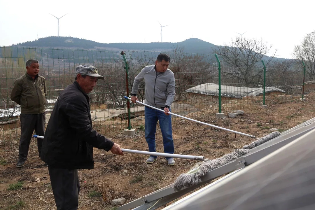 13:30沿著陡峭山路晚上走,王棟棟來到了村里的光伏發(fā)電項目,“有兩塊光伏板壞掉了,要及時向扶貧辦報修調(diào)換,不然會影響發(fā)電量”。王棟棟叮囑管理人員。報修完之后,王棟棟和維護(hù)人員一起對光伏板進(jìn)行擦洗維護(hù)。