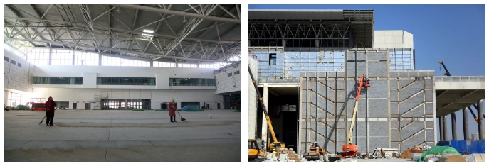 遙看會展中心,5個展館高低錯落、依次排開,頗為壯觀,外形似泉水流動起伏,建筑的陽剛之美與泉水靈動之姿完美融合。進入展館內(nèi)部,4號館、5號館內(nèi)部建設(shè)已基本完成,目前展廳基本具備布展條件,4號館、5號館均為一層展館,地面承載5噸/平方米,凈高度12~19米;1號館、2號館、3號館目前正在進行外墻保溫及涂料施工,計劃本月底整體完工,5月底竣工,屆時將滿足大型機械展等各類展會需求。
