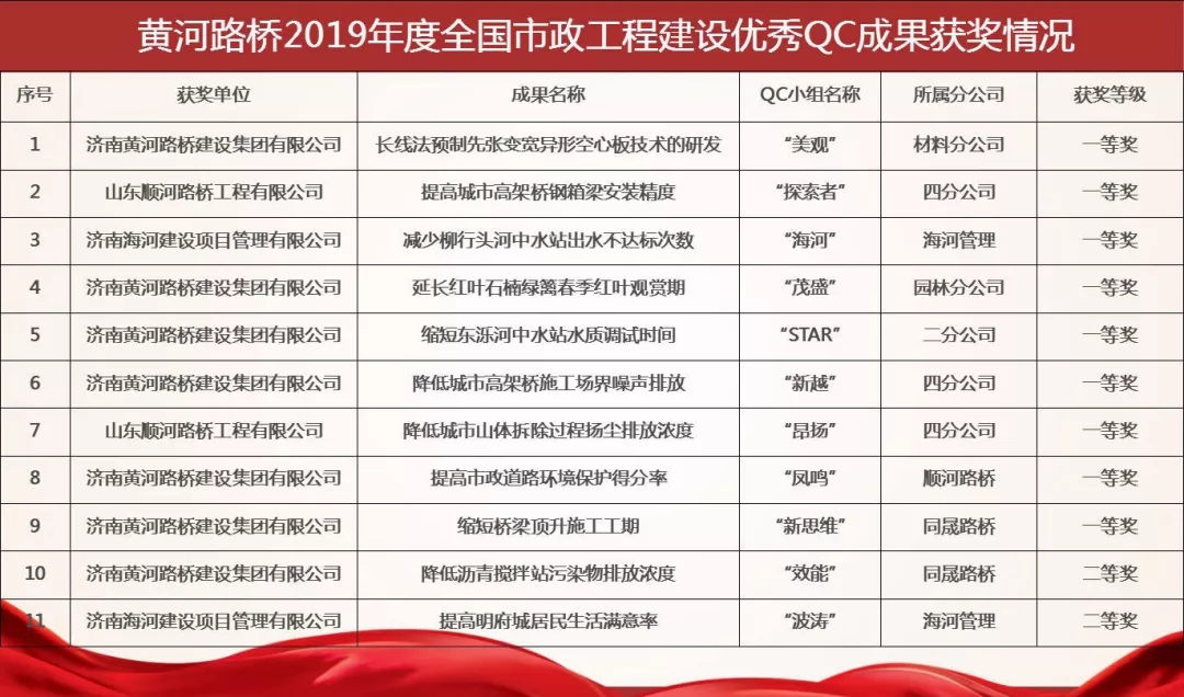 濟南黃河路橋建設(shè)集團有限公司共有11項成果參與發(fā)布,其中9項成果榮獲一等獎,2項成果榮獲二等獎;同時黃河路橋建設(shè)集團被評為2019年“全國市政工程建設(shè)QC小組活動優(yōu)秀企業(yè)”,這是自2013年以來連續(xù)七年獲得此項殊榮。