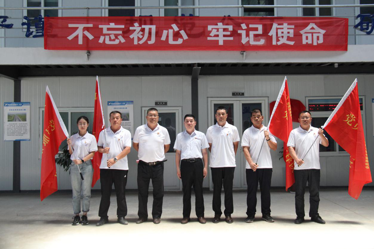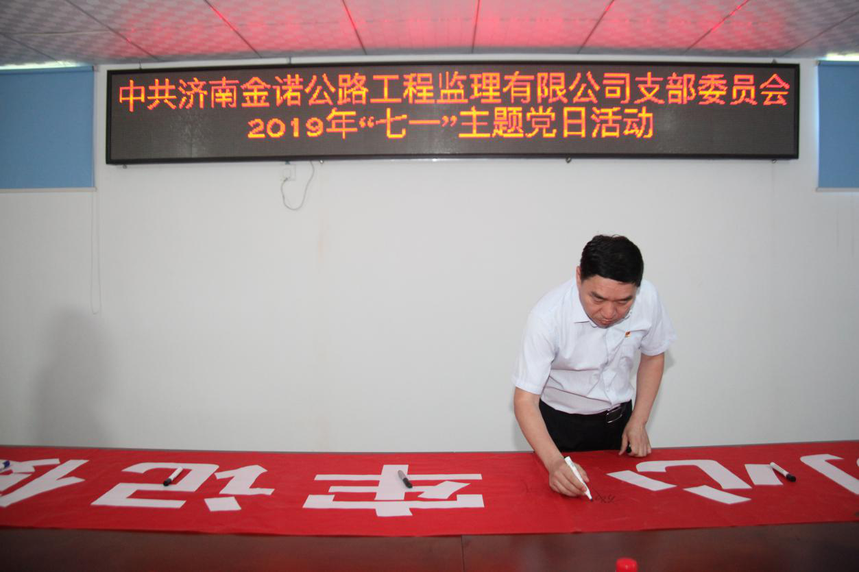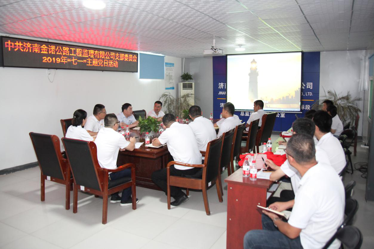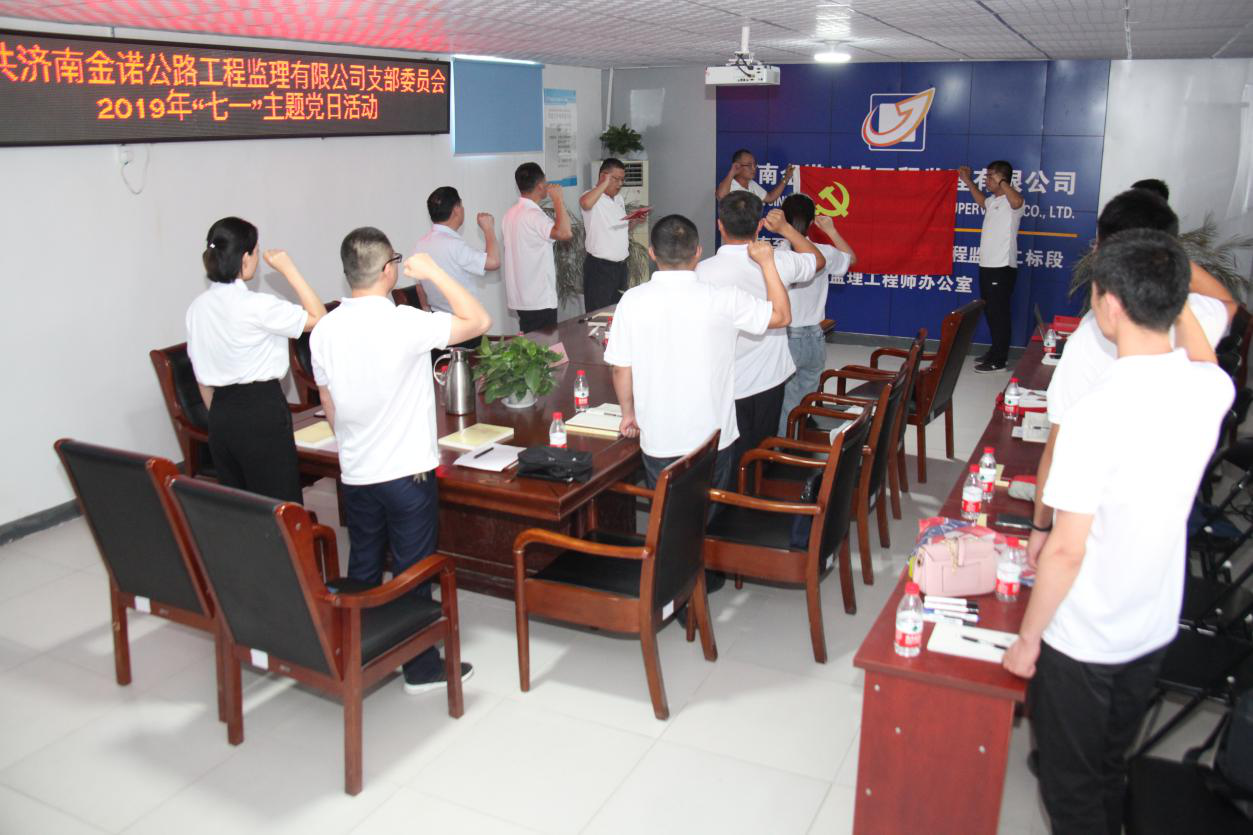為慶祝中國共產黨成立98周年,喜迎祖國70周年華誕,充分發揮黨員的先鋒模范作用,深入推進“不忘初心 牢記使命”主題教育活動開展,錘煉黨員“忠誠、干凈、擔當”的政治品格,實現以“黨建促生產”的目標。7月1日上午濟南金諾公路工程監理有限公司黨支部在濟南至樂陵高速公路南延工程總監辦舉行了“打贏交通樞紐攻堅戰  創建黨員服務先鋒隊”活動啟動儀式暨“慶七一”主題黨日活動。公司黨員、積極分子共20余人參加活動。