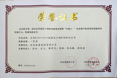 近日,山東省建筑業協會舉辦第一屆山東省建設工程BIM成果競賽暨“中建八一”杯BIM競賽公開答辯和競賽成果交流會,濟南城建集團有限公司攜1項作品“濟南G309-S101連接線工程BIM技術應用”參加。經過技術人員匯報、答辯與專家評選,城建集團參賽作品最終榮獲一等獎。