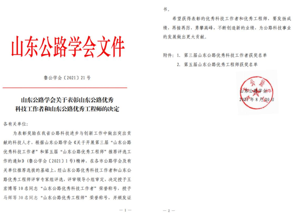 近日,山東公路學會發(fā)布了《關于表彰山東公路優(yōu)秀科技工作者和山東公路優(yōu)秀工程師的決定》(魯公學會〔2021〕21 號)文件,金宇公司李玉寶同志榮獲“山東公路優(yōu)秀科技工作者”榮譽稱號,張加華同志榮獲“山東公路優(yōu)秀工程師”榮譽稱號。