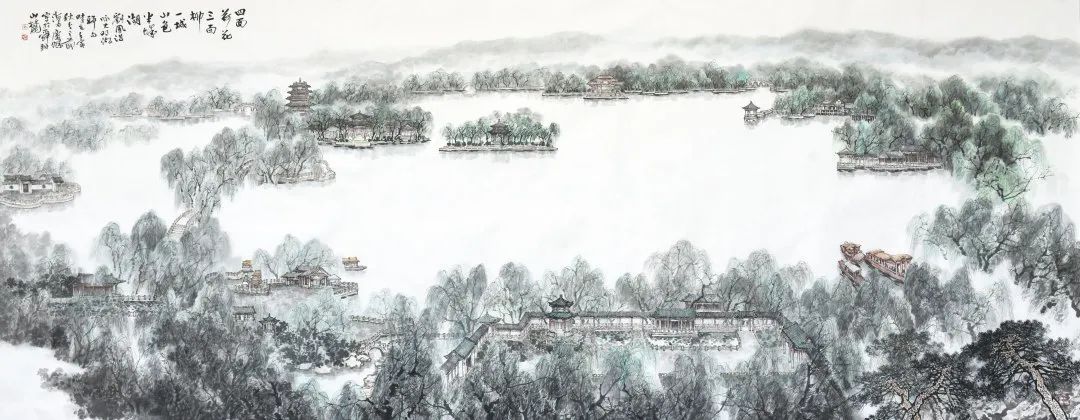如果將濟南的明信片寄往遠方,大明湖一定是其中的選擇。濟南市文聯副主席、濟南市美術家協會主席李慶杰為此次畫展創作的《名湖攬勝》作品,將大明湖舊貌新顏相融合,“四面荷花三面柳,一城山色半城湖”“佛山倒影”等意境躍然紙上,體現了近些年來天更藍、樹更綠、水更清的高質量發展“濟南高度”。
