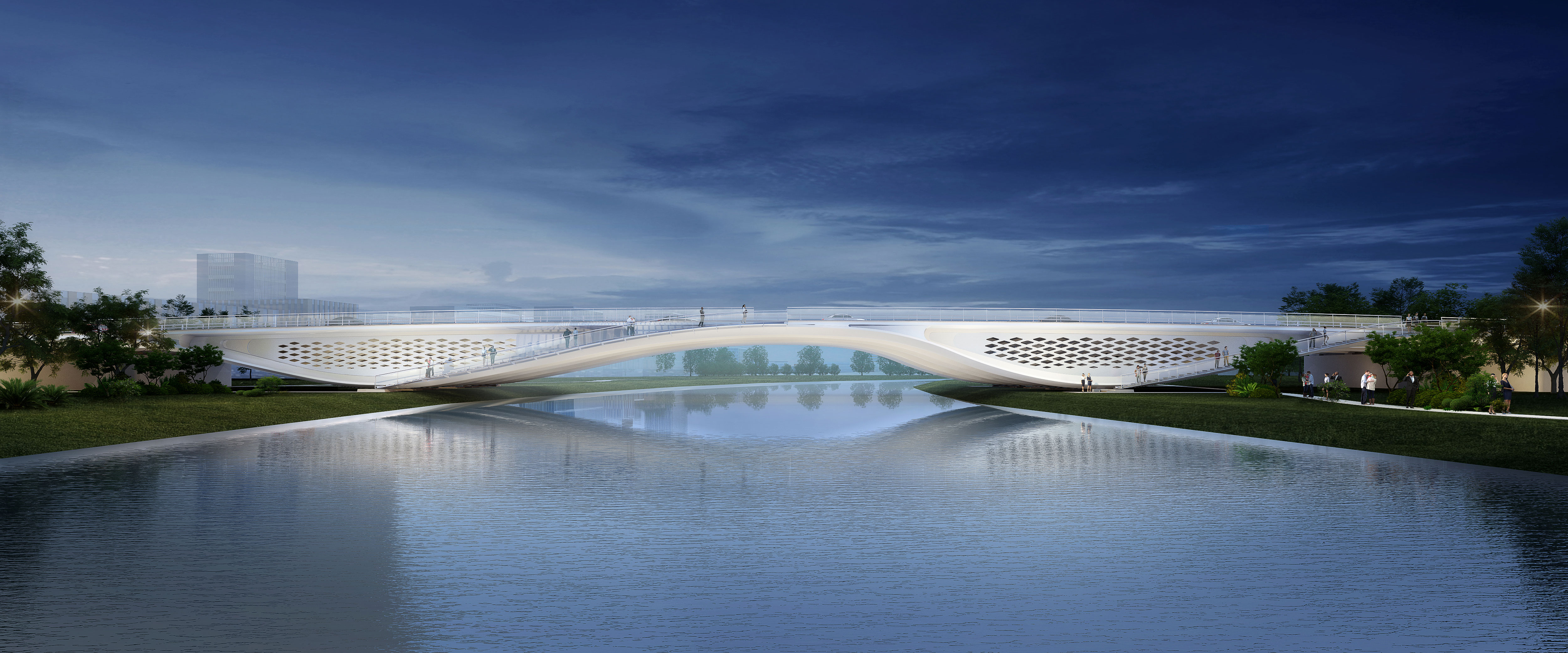 橫一路、橫二路大寺河橋作為起步區規劃的第一批景觀橋梁,由濟南城市建設集團有限公司受委托建設,兩座橋梁由世界著名橋梁設計師Marc MIMRAM先生主設計,通過研究濟南的歷史和文化,以泉與太極這個設計為根基,將泉城的剛中有柔、柔中帶剛,與太極互為印證,力與美相結合,完成兩座景觀橋梁的設計。