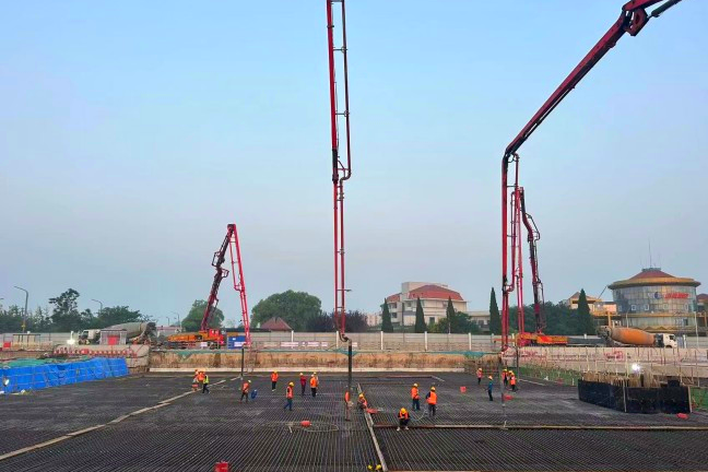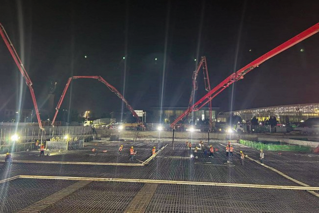 本次澆筑從9月6日22時開始,歷時30小時,4臺泵車聯(lián)合作戰(zhàn),順利澆筑完成3800立方米混凝土。為完成施工區(qū)域道路導(dǎo)改及管線遷改,臨八路人防頂板先行施工,人防蓋板由鋼管柱支撐,長度49米,寬度73.5米,蓋板下主體結(jié)構(gòu)及土方施工采用蓋挖法施工,結(jié)構(gòu)主體采用C45P8抗?jié)B混凝土。
