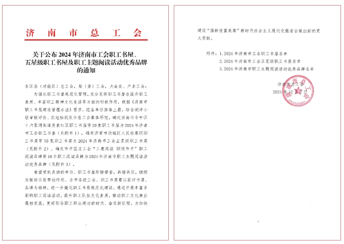 近日,市總工會公布了《關于公布2024 年濟南市工會職工書屋、五星級職工書屋及職工主題閱讀活動優秀品牌的通知》,濟南城市建設集團有限公司職工書屋獲評濟南市工會五星級職工書屋。