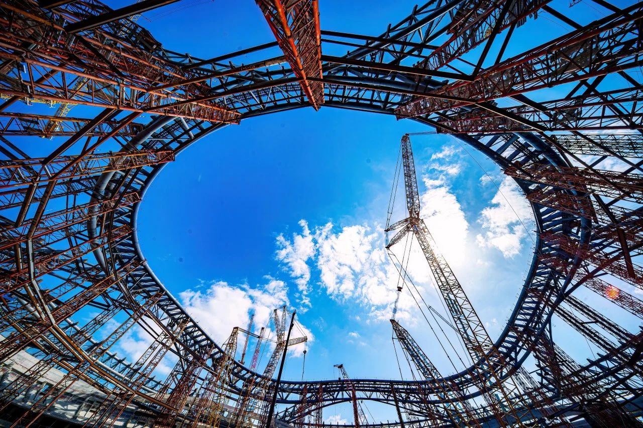 項目鋼結構施工擁有多項國內之最,屋蓋鋼結構最大懸挑長45米,是國內體育場館懸挑長度之最;施工跨越夏秋冬三季,溫度變化會形成巨大誤差,累積合龍段施工難度為目前國內之最;鋼結構拼裝完成后,需要將支撐胎架進行分級卸載,卸載過程中產生的變形量是國內同類場館之最。