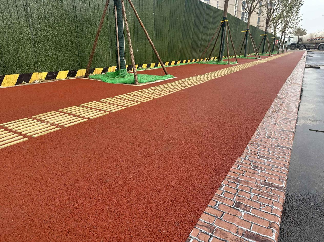 濟南新舊動能轉換起步區總部經濟四期工程安置五區項目積極響應創新提效號召,在人行道使用聚氨酯彩色瀝青,收效良好。聚氨酯彩色瀝青分子鏈中含有氨酯基或異氰酸酯基類的膠粘劑,其與瀝青材料通過物理粘接形成強度不同的混合物。聚氨酯膠粘劑具備化學反應活性,與碎石混合后可以吸收空氣中的水分或外加水以及與碎石表面結合水發生化學反應,形成強度極高的化學粘接,從而極大提高混凝土的力學強度。項目人員精心籌備,嚴格按照規范施工,鋪筑路面表面平順一致,整體效果美觀大方。