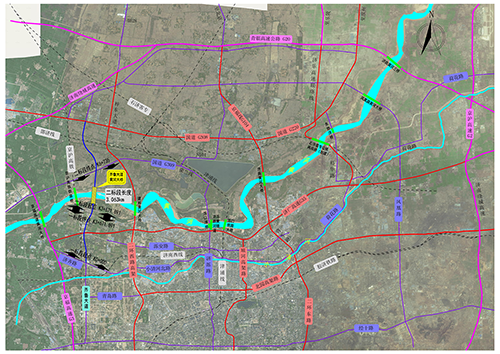 一標段南起現狀濟齊路,向北與虹吸干渠南路、虹吸干渠北路、吳家堡路、治黃路、規劃路相交,采用高架形式跨越太平河南支路、太平河北支路、美里路、太平河北路、濟廣高速后,在美里湖路前落地,高架橋兩側設置一對輔道實現各交通流向的轉換,終點接黃河大橋引橋,平面線位與規劃線位一致,道路全長3671.89米。